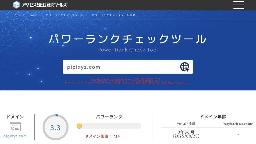 今回「ドメイン価値 714」という数値も表示されました。これはツール独自の算出で、あくまで参考程度。